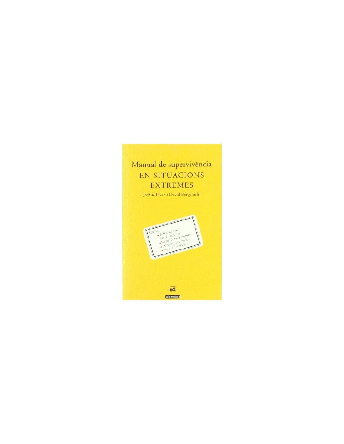 Aquesta és la guia indispensable i indiscutible per sobreviure quan les coses van mal dades. Experts en supervivència donen instruccions detallades i amb il·lustracions sobre tot el que cal saber ràpidament per:-Defensar-se d'un tauró-Encaixar un cop de puny-Assistir un part en un taxi-Reaccionar davant l'atac d'una serp verinosa-Saltar d'un cotxe en marxa-Identificar una bomba-Fugir d'abelles assassines-Sobreviure si no se t'obre el paracaigudesi moltes altres situacions extremes.ATENCIÓ: Si escannegeu el llibre, explotarà