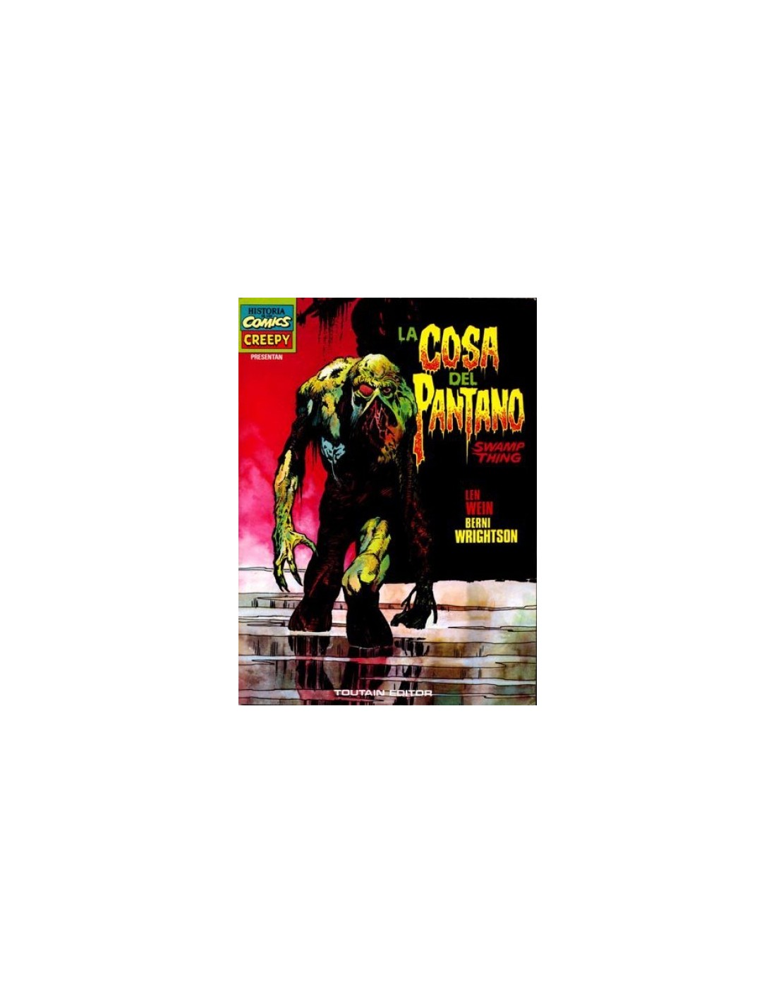 Libro en rústica con 112 páginas en color y blanco y negro y cubiertas en color. Traduce los primeros episodios de la serie "La cosa del pantano" publicados originalmente en House of Secrets nº 92 y en los primeros cuatro números de la revista Swamp Thing (DC, principios de la década de 1970).